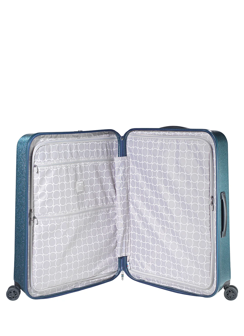 ”Dot-Drops Chapter 3” kufferten er med til at skabe en fantastisk udstråling af glitter, glæde og holdbarhed. Kuffertens glitrende detaljer fuldender et unikt look. Men det er ikke kun det ydre, der betyder noget. Dot-Drops kufferterne holder også til lidt af hvert, og ikke mindst har kufferterne fire fantastiske dobbelt-hjul samt en god indretning med lukkede lommer og stropper i hver side. Alle Dot-Drops kufferter findes i forskellige farver og størrelser. Kufferten på billedet er en stor kuffert til 12+ dage.