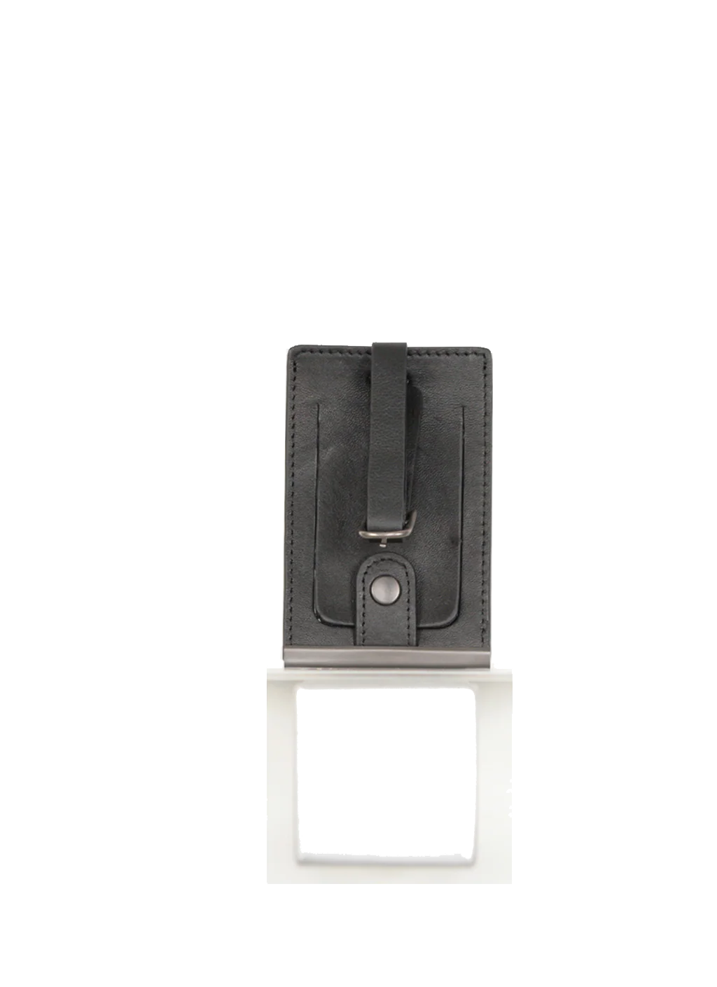 KKDK Luggage Nametag i kalveskind. Et lækkert og genkendeligt navneskilt i ægte kalveskind fra KKDK of Copenhagen. Du kan skrive navn og adresse under læder overslaget, som lukkes med en knap på fronten. Navneskiltet kan sættes fast på håndtagene på alle kufferter og tasker ved hjælp af det justerbare bæltespænde i læder med metalspænde.